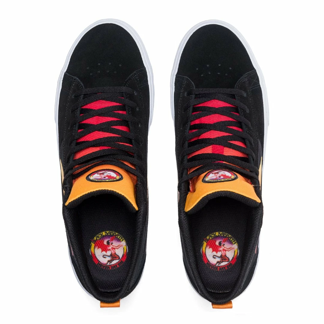 Inspired by the infamous Never Say Die Album. Black suede /canvas with gradient highlights on upper. Album artwork patch on tongue with matching footbed along with printed art on outsole sidewall.